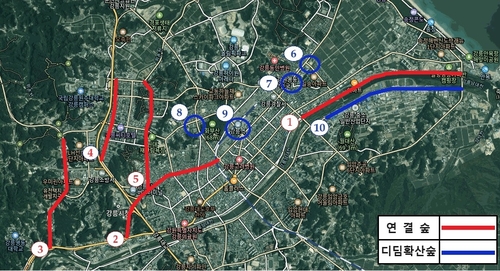 연결숲(15.4㎞)은 강릉대로 등 5곳 도심가로변에 관목과 교목을 복층으로 식재한 녹지대를 신규로 조성해 녹시율을 높이는 숲이다.