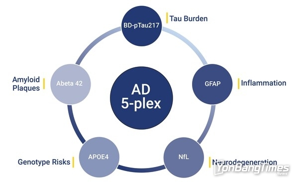 질병 조기 발견 기술의 발전에 주력하는 정밀 단백질체학 선도 기업 알라마 바이오사이언스(Alamar Biosciences, 이하 "알라마")가 연구 전용(RUO) NULISAqpcr™ AD 5-플렉스 어세이 출시를 발표했다. 이는 알츠하이머협회(Alzheimer's Association) 권장 가이드라인과 관련된 5대 혈액 기반 바이오마커, 즉 뇌 유래 인산화 타우 217(BD-pTau217), 신경섬유 경쇄(NfL), 아밀로이드 베타 42(Aβ42), 아교섬유산성 단백질(GFAP), APOE4(보유자 상태)를 혈액 또는 혈장 샘플 하나로 정량적으로 동시 측정할 수 있는 혁신적인 솔루션이다.