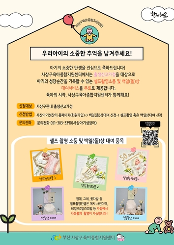 부산 사상구육아종합지원센터(센터장 안진희)는 2026년 한 해 동안 관내 출생 신고 가구를 대상으로 아기의 성장 순간을 기록할 수 있는 셀프촬영 소품과 백일·돌상 대여 서비스를 무료로 제공하는 '사상 육아프렌즈' 사업을 추진한다고 밝혔다.