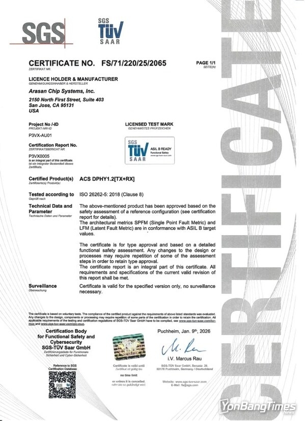 산호세, 캘리포니아주, 2026년 2월 5일 -- MIPI 표준용 IP를 최초로 선보인 기업 아라산 칩 시스템즈(Arasan Chip Systems)가 자사 2세대 초저전력 MIPI® D-PHY IP에 대해 ISO 26262 기능 안전 인증을 획득했다고 2월 4일 발표했다. 아라산은 2005년부터 MIPI 협회(MIPI Association)의 집행 멤버로 활동해 왔으며, 업계에서 MIPI IP 포트폴리오를 가장 폭넓게 공급하고 있다. ISO 26262 인증을 획득한 MIPI D-PHY IP는 40nm부터 4nm까지 파운드리 공정 노드에서 즉시 라이선스 제공이 가능하다. NDA를 체결한 적격 고객에게는 요청 시 추가 안전 관련 자료와 기술 세부 사항도 제공된다.