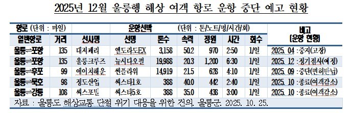 이러함이 지난해 10월부터 언론을 통해 보도된 바와 같이(최초 보도 : 대구일보. 2025. 10. 19), 포항, 묵호, 강릉, 후포 등 주요 항로의 여객선들이 고장, 면허 반납, 경영 악화(여객 감소) 등의 이유로 잇따라 운항을 중단하거나 종료를 예고했다. 이는 단순한 교통 불편을 넘어 울릉도라는 도서 지역의 고립을 의미하였다.