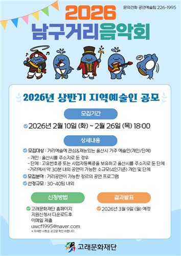 (재)고래문화재단(이사장 서동욱)은 지역 예술인의 활동 무대를 넓히고 시민들이 일상 속에서 자연스럽게 문화를 즐길 수 있도록 '2026년 남구 거리음악회 지역예술인 지원사업'상반기 공모를 실시한다.