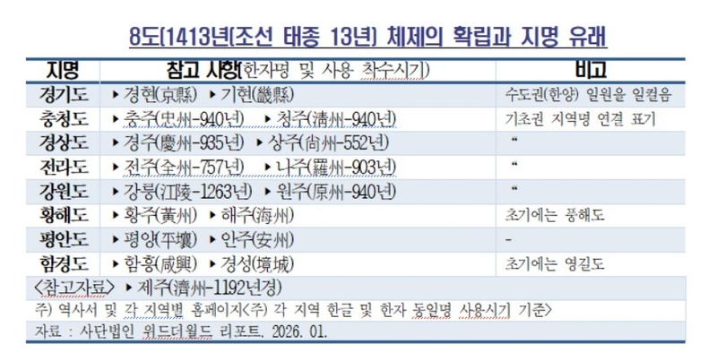 1413년에는 ▴강원 ▴경기 ▴경상 ▴전라 ▴충청 ▴평안 ▴함경 ▴황해 등의 8도(道) 체제가 확립되었다. 이의 역사는 613여 년에 이른다.
