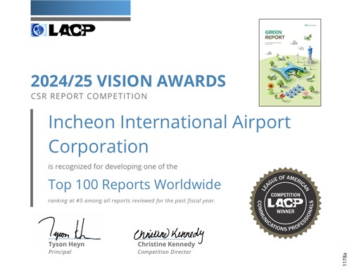 인천국제공항공사(사장 이학재)는 공사의 저탄소·친환경 경영성과를 담은 친환경 보고서(2025 그린 리포트)가 미국 커뮤니케이션 연맹이 주관하는 '2024-25 비전 어워즈(Vision Awards)'에서 2년 연속 사회책임보고서 부문 대상을 수상했다고 24일 밝혔다.