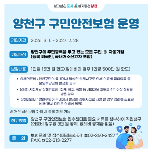 양천구(구청장 이기재)는 일상 속 예기치 못한 사고로부터 구민의 든든한 울타리가 돼주고 있는 '구민안전보험'과 '구민 자전거보험' 지원 사업을 올해도 이어간다고 3일 밝혔다. 보험료는 전액 구가 부담하며, 약 44만 모든 구민은 별도 절차 없이 1년간 자동 가입된다.