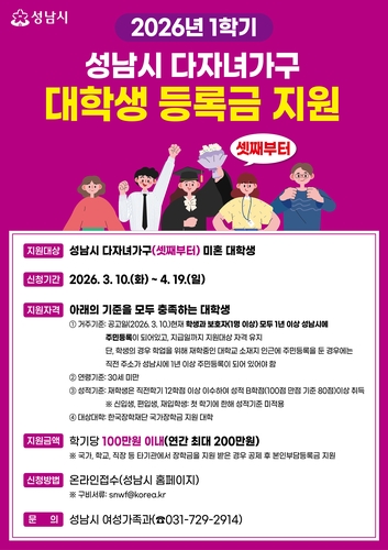 성남시(시장 신상진)는 다자녀가구의 경제적 부담을 덜기 위해 셋째 이상 대학생에게 학기당 최대 100만원(연 200만원)의 등록금을 지원한다고 12일 밝혔다.
