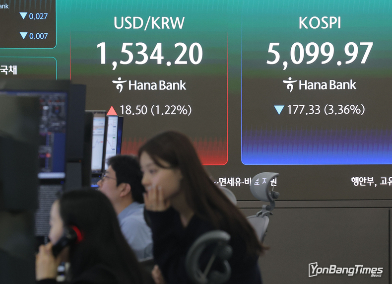 미국·이스라엘-이란 전쟁이 격화되며 31일 원-달러 환율이 1530원대를 돌파했다. 글로벌 금융위기 때인 2009년 3월9일(종가 기준 1549.0원) 이후 17년여 만에 최고치다. 코스피도 4거래일째 전 거래일 대비 하락세를 이어가고 있다. 장기화되는 중동 사태 여파로 금융시장 전반에 불안이 고조되는 모습이다. 한국거래소에 따르면 이달 들어 코스피는 19.08% 급락했다. 지난달 말 6,244.13이던 지수는 이날 5,052.46으로 주저앉았다.