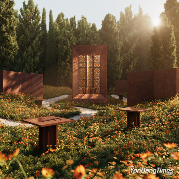 이 평온한 전시물은 풍화된 금속과 자연 소재에서 색상을 끌어내며, 마치 주변 환경에 부과된 것이 아니라 자연스럽게 생겨난 것 같은 느낌을 준다. 야생 들꽃 초원에서 솟아오른 이 설치물은 자연과의 상호성에 뿌리를 둔 디자인 철학을 반영한다.