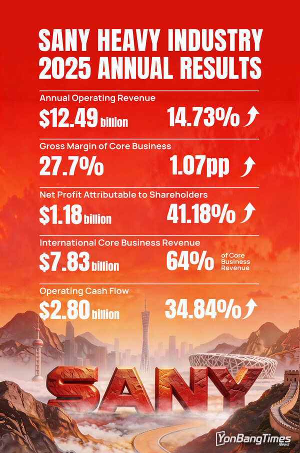 베이징, 2026년 4월 9일 -- 산이 중공업(SANY Heavy Industry)(600031.SH, 06031.HK)이 2025년 재무 실적을 발표했다. 매출은 전년 대비 14.73% 증가한 124억 9000만 달러를 기록했다. 주주 귀속 순이익은 41.18% 상승한 11억 8000만 달러를 달성했다. 영업 활동으로 인한 순 현금 창출액은 전년 대비 34.84% 증가한 28억 달러를 기록했다.