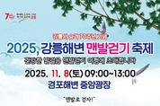 강릉시(시장 김홍규)는 오는 11월 8일(토) 경포해변 일원에서 '2025 강릉해변 맨발걷기 축제'를 개최한다. 이번 행사는 버스킹 공연, 걷기 특강, 바른 자세 체험 부스 운영, 해변 맨발걷기 등 다양한 프로그램으로 구성됐다. 참가자들은 강릉의 아름다운 경포 바다를 배경으로 모래사장과 송림을 맨발로 걸으며 일상의 피로를 내려놓고 힐링의 시간을 갖게 된다. 엄금문 관광정책과장은 "이번 축제에 많은 시민과 관광객이 함께 참여해 강릉의 걷기 좋은 도시, 머물고 싶은 도시로서의 매력을 몸소 느끼는 시간이 되길 바란다"고 말했다. '2025 강릉해변 맨발걷기 축제'는 오는 11월 7일(금)까지 참가자를 사전 모집하며, 자세한 사항은 강릉시 누리집 공지사항(https://gn.go.kr)에서 확인할 수 있다.
