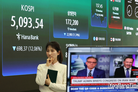 연방타임즈 = 이효주 기자 | 코스피가 미국과 이란의 전쟁으로 중동의 지정학적 긴장이 커진 가운데 37% 넘게 폭락해 5,800선 아래로 주저앉았다. 코스피는 전 거래일보다 452.22포인트(7.24%) 내린 5791.91에 장을 마감했다. 3일 코스피 낙폭(452.22포인트)은 역대 최대 규모다. 하락률 역시 미국 경기침체 우려로 증시가 급락했던 지난 2024년 8월 5일(-8.77%) 이후 가장 컸다. '대장주' 삼성전자와 SK하이닉스 주가도 10% 안팎으로 급락했다. 지수는 전장보다 78.98포인트(1.26%) 내린 6165.15로 출발해 낙폭을 키웠다. 코스피200 선물지수는 이날 정오께 5% 넘게 급락하면서 프로그램매도호가 일시효력정지(사이드카)가 한 달 만에 발동되기도 했다. 특히 이날 한국형 공포지수로 불리는 ‘코스피200 변동성지수(VKOSPI)’는 전장보다 16.37% 급등한 62.98에 장을 마치며 지난 2020년 3월 19일(69.24) 이후 약 6년 만에 최고치를 나타냈다. 이날 장 마감 시점 기준 코스피 시가총액은 4626조 원으로, 직전 거래일 5037조 원에서 411조 원이 증발했다. 유가증권시장에서 외국인이 5조 1731억 원 순