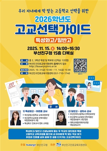 부산 부산진구(구청장 김영욱)는 11월 15일 토요일 오후 2시 구청 15층 다복실에서 '2026학년도 고교선택가이드 현장 설명회'를 개최한다고 밝혔다.