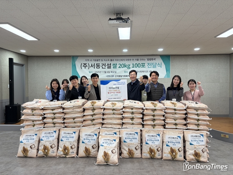 ㈜서동건설(대표 서철수)이 지역사회 나눔 활동에 앞장서고 있다. 서동건설은 11월 6일 대구 북구 산격종합사회복지관이 운영하는 무료급식사업 ‘집밥한끼’에 쌀 20kg 100포를 후원하며, 거동이 불편하거나 저소득 홀로 어르신들을 위한 따뜻한 지원을 펼쳤다. 이번 후원은 단순한 식사 지원을 넘어 지역 내 어려운 이웃에게 온정을 전하는 의미 있는 나눔으로 평가받고 있다. 서철수 대표는 “이번 나눔이 어르신들께 큰 위로가 되길 바란다”고 밝혔다.