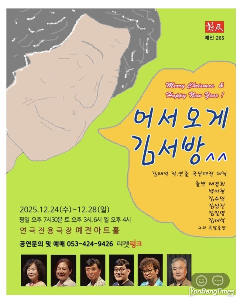 극단 예전은 12월 24일(수)부터 28일(일)부터 평일 오후 7시 30분, 토요일 오후3시, 6시 일요일 오후 4ㅣ에 연극전용극장 예전아트홀에서 '어서오게 김서방' 연극 공연을 한다. 이번 연극은 장수시대를 맞이한 시점에 사회적으로 문제가 되는 치매를 소재로 했다.