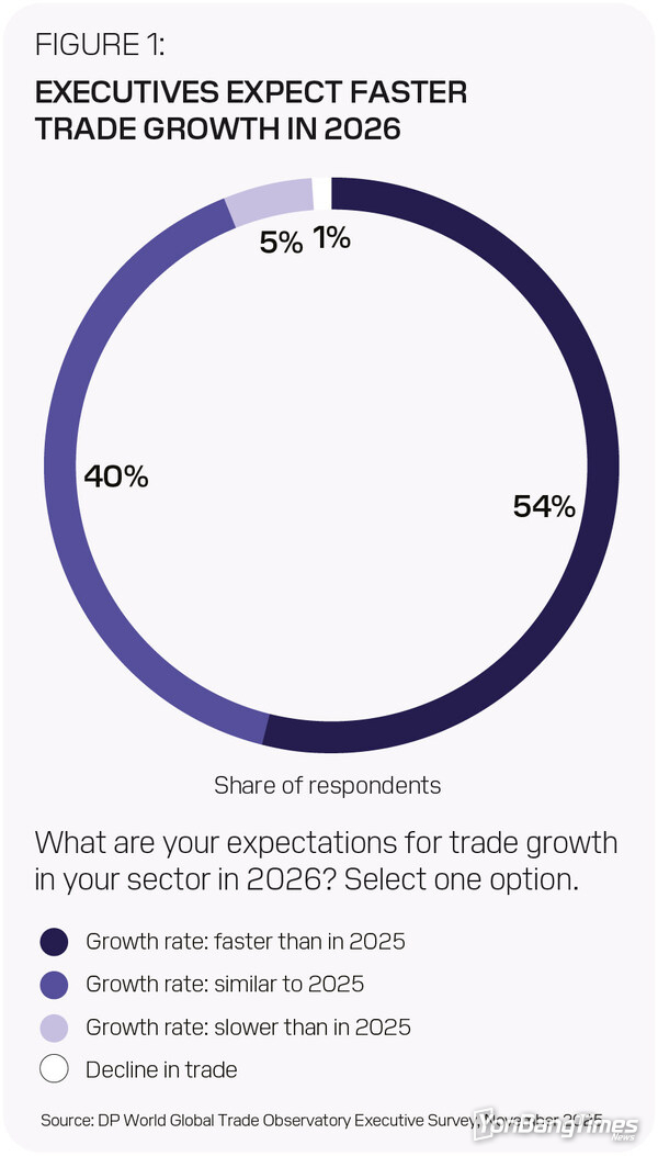 다보스, 스위스, 2026년 1월 21일 -- 글로벌 무역 전망은 취약해 보이지만 비즈니스 신뢰도는 그렇지 않다. 이는 DP 월드(DP World)의 신간 글로벌 무역 관측소(Global Trade Observatory, GTO) 2026 연례 전망 보고서(Annual Outlook Report 2026)의 요점으로, 응답자의 94%가 마찰과 변동성 증가에도 불구하고 2026년도 무역 성장세가 2025년도와 비슷하거나 이를 상회할 것으로 예상했다.