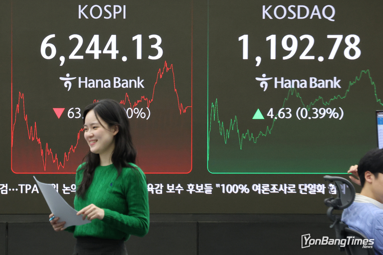 코스피가 27일 장중 등락하다 외국인의 역대급 매도세에 6,240대에서 하락 마감했다. 한국거래소에 따르면 코스피는 전장보다 63.14포인트(1.00%) 내린 6244.13에 마감했다. 전날 코스피는 엔비디아의 호실적에 힘입어 3.67% 급등, 사상 처음 6300선을 돌파했으나 하루 만에 6200선으로 내려갔다.