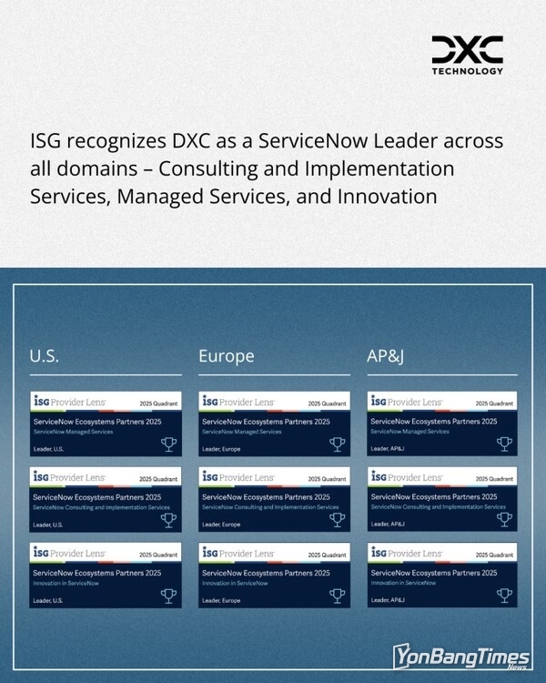 애슈번, 버지니아주, 2025년 9월 22일 -- 포춘 500대 기업(Fortune 500)이자 세계적인 기술 서비스 제공업체인 DXC 테크놀로지(DXC Technology)(NYSE 상장 코드: DXC)가 굴지의 다국적 기술 연구 및 자문 회사인 ISG의 Provider Lens™ 서비스나우 에코시스템 파트너스 2025(ServiceNow Ecosystem Partners 2025) 연구에서 미국, 아시아 태평양 및 중동, 유럽의 모든 부문 리더로 인정받았다. 이와 같은 위업에서는 엘리트 서비스나우 에코시스템 파트너(Elite ServiceNow Ecosystem Partner)로서 DXC의 위상뿐만 아니라, 가시적인 투자 효과를 보장하고, 심층적인 업계 전문성을 활용하며, 기술 개발에 끊임없이 투자해 고객에게 더 나은 서비스를 제공하는 DXC의 검증된 역량도 엿볼 수 있다.