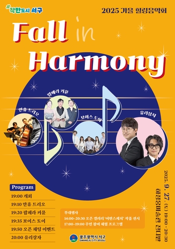 광주광역시 서구(구청장 김이강)는 오는 27일 오후 7시 농성동 하정웅미술관 앞 잔디광장에서 '2025 가을 힐링음악회 - 폴 인 하모니(Fall in Harmony)'를 개최한다.