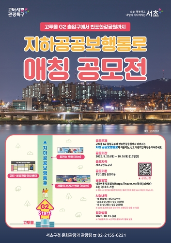 전성수 서초구청장은 "주민들의 창의적이고 톡톡 튀는 아이디어가 모여 지하 공공보행통로가 새 이름으로 거듭나길 바란다"며 "이번 공모전을 통해 해당 공간이 더욱 많은 이들에게 사랑받고, 지역 문화예술의 중심지로 자리매김하길 기대한다"고 밝혔다.