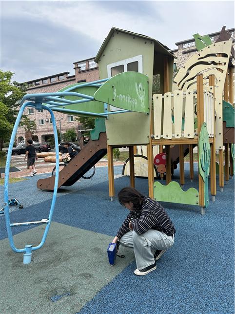 이번 검사는 도시공원 내 어린이놀이시설을 대상으로 했으며, XRF(엑스선형광분석기)를 이용해 바닥재 색상마다 중금속(납, 카드뮴, 수은, 6가크로뮴)을 측정했다.