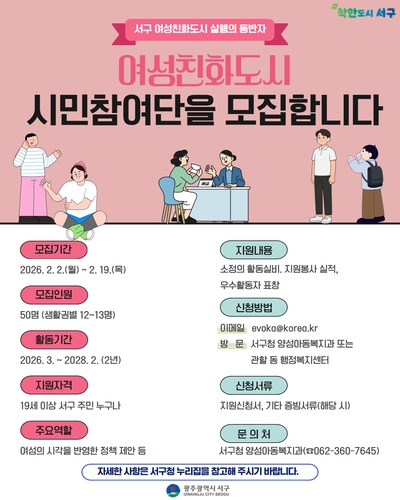 모집 인원은 총 50명이며 여성친화도시 조성과 양성평등 실현에 관심 있고 월 1회 이상 활동이 가능한 19세 이상 서구 주민이면 누구나 지원할 수 있다. 서구는 20∼40대 청·장년층과 여성친화도시 관련 활동 경험자, 신규 참여자를 우대할 계획이다.