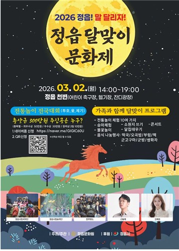 정읍문화원이 2026년 정월대보름을 맞아 오는 3월 2일 정읍 천변 어린이 축구장 일원에서 2026 정읍 달맞이 문화제 '정읍! 말 달리자!'를 개최한다. 이번 행사는 사라져가는 세시풍속을 계승하고 시민의 안녕을 기원하기 위해 마련됐다.