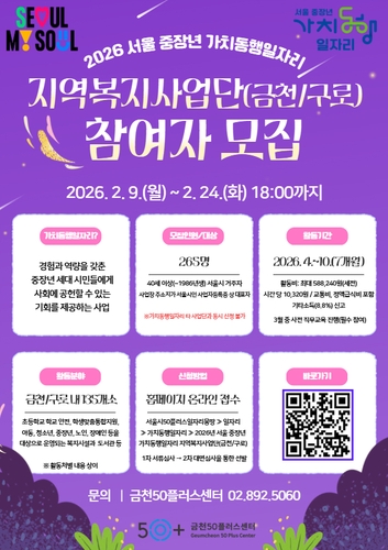 금천구(구청장 유성훈)는 금천50플러스센터(센터장 김미성)에서 경험과 역량을 갖춘 중장년 세대들에게 지속적인 사회참여를 지원하기 위해 '2026년 서울 중장년 가치동행일자리사업' 참여자를 모집한다고 밝혔다.