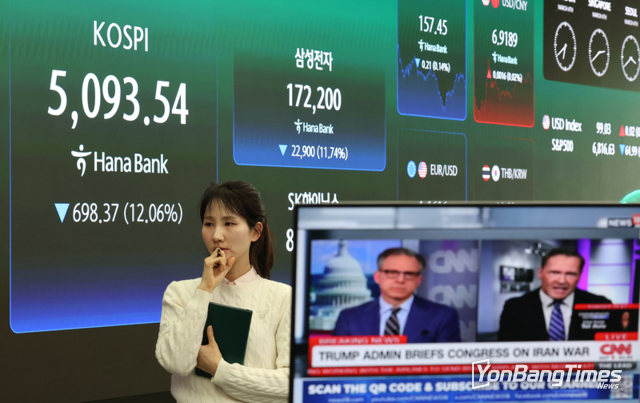 코스피가 미국과 이란 간 전쟁 발발 이후 지정학적 긴장감이 커지면서 12% 폭락해 5,100선마저 내줬다.
