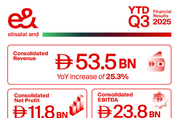 연방타임즈 = 배용철 기자 | 2025년 1~9월 연결 매출 535억 디르함으로 전년 동기 대비 25.3% 증가 2025년 1~9월 연결 순이익 118억 디르함으로 전년 대비 39.7% 증가 그룹 전체 가입자 수 2억 220만 명 돌파 아부다비, 아랍에미리트, 2025년 10월 30일 -- e&가 2025년 3분기 연결 기준 매출이 전년 동기 대비 29.2% 증가한 186억 디르함(AED)을 기록했다고 발표했다. 2025년 1~9월 누적 연결 매출은 535억 디르함으로, 전년 동기 대비 25.3% 증가했다. 이는 그룹의 탄력적인 비즈니스 모델과 상반기 역대 최고 실적을 바탕으로 성장을 지속할 수 있는 역량을 반영한다. 그룹은 전 사업 부문에서 강력한 성장세를 유지했다. 3분기 연결 순이익은 30억 디르함을 기록했으며, 1~9월 누적 연결 순이익은 118억 디르함으로 전년 대비 39.7% 증가했다. 3분기 EBITDA(감가상각 전 영업이익)는 전년 대비 29.2% 증가한 84억 디르함을 기록하며 마진율은 45.0%를 나타냈다. 2025년 1~9월 누적 EBITDA